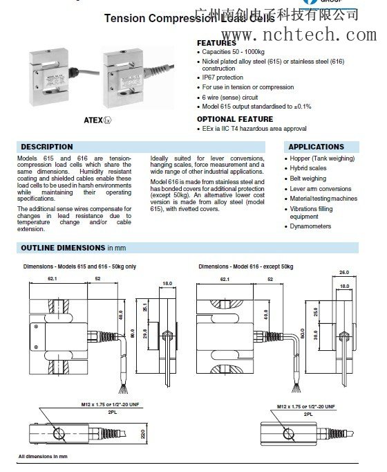 S 型(616)不銹鋼材質(zhì);防潮密封膠;量程(100~1000kg) ;綜合精 度:0.02%;防護(hù)等級(jí):IP65/IP67;基本配件:M6001;用于機(jī)電結(jié) 合秤、皮帶秤、筒槽計(jì)量、測(cè)力系統(tǒng)、配料秤、定量系統(tǒng)。 616-1000kg 稱(chēng)重傳感器電子版說(shuō)明: 【廣州南創(chuàng)電子】傳感事業(yè)部培訓(xùn)資料 型號(hào) 616-50kg 616-100kg 616-150kg 616-200kg 616-300kg 616-500kg 616-750kg 616-1000kg 用于拉伸或壓縮; 標(biāo)準(zhǔn)化輸出±0.1%; 線(xiàn) 6 (感 應(yīng))電路。mHU廣州南創(chuàng)電子科技有限公司