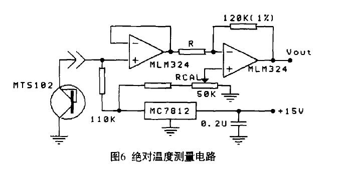 絕對溫度的實際測量電路如圖6所示.圖中溫度傳感器的輸出接到同相單位增益緩沖放大器(它由1 /4的MLM324運(yùn)放組成)。由于該放大器具有輸人阻抗高輸出阻抗低的特氛所以可減小放大器對傳感器所取的信號電流。