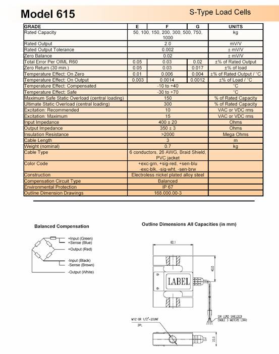 615-1000kg,tedea 615-1000kg稱重傳感器,美國特迪亞特性:615和616是尺寸相同的拉壓兩用傳感器。防潮保護(hù)和屏蔽線保證了傳感呂在惡劣環(huán)境下工作,仍能符合規(guī)格。附加的反饋線補(bǔ)償了因溫度和延長導(dǎo)線引起的阻值變化。機(jī)械秤改造、吊鉤秤、力量測量理想的選擇,廣泛的工業(yè)應(yīng)用。616為不銹鋼材質(zhì),采用膠封邊蓋附加防護(hù)(除50KG)。低成本版本(615)采用合金鋼材質(zhì),鉚釘固定邊蓋。MJl廣州南創(chuàng)電子科技有限公司