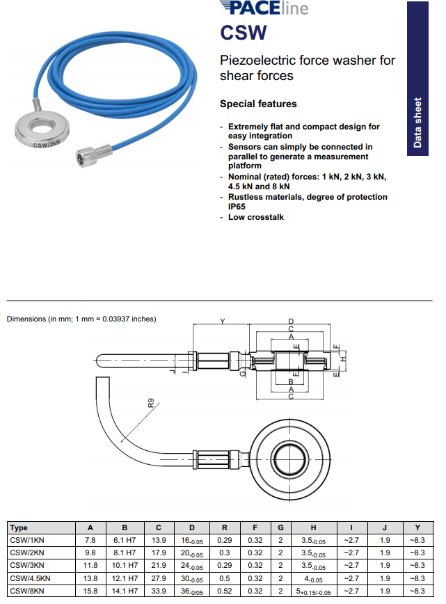 CSW用于剪切力的壓電微型負載墊圈PACEline CSW系列的壓電負載墊圈有助于可靠地測量剪切力。它的典型應(yīng)用包括機械加工過程的力監(jiān)測,如切削、銑削和車削,以及其他*監(jiān)測任務(wù)。用于測量剪切力的PACEline CSW壓電微型負載墊圈:容量從1kn到8kn