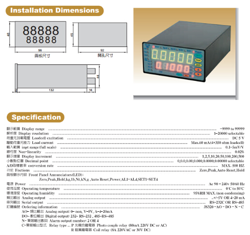 臺(tái)灣JIHSENSE JS-300稱重顯示控制器規(guī)格圖:AA1廣州南創(chuàng)電子科技有限公司