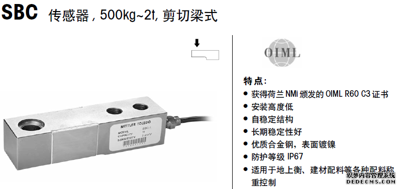 托利多SBC-1t為剪切梁傳感器,優(yōu)質(zhì)合金鋼材質(zhì),表面鍍鎳。主要用于地上衡及罐體秤適用于地上衡、平臺秤、皮帶秤、化工、食品、醫(yī)藥等行業(yè)配料稱重控制,標(biāo)準(zhǔn)量程為500, 1000, 2000kg。