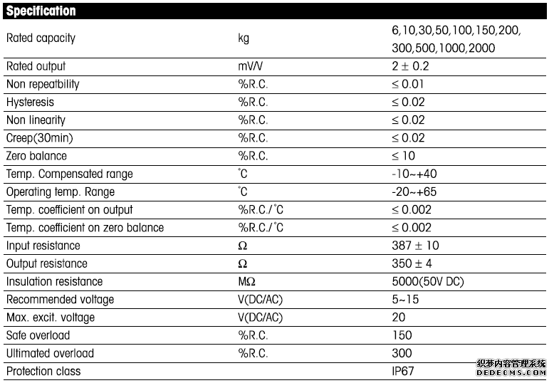 適用于干燥環(huán)境中,主要用于臺(tái)秤、包裝秤、皮帶秤、檢重秤和過程控制的場合。傳感器容量有6,10,30,50,100,150,200,300,500,1000,2000kg