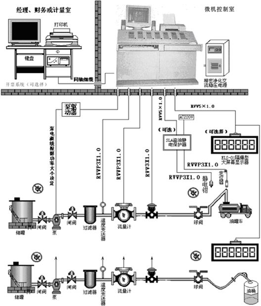 系統(tǒng)由主機(工業(yè)控制計算機)、下位機(定值控制儀)、流量計、溫度變送器、輸料泵、電液(磁)閥和現(xiàn)場隔爆型大屏幕顯示器等主要部分構(gòu)成,其工作主要包括進出物料的準確定量發(fā)放、灌裝和各類物料的進出數(shù)據(jù)管理,日、月、年進出物料的歷史數(shù)據(jù)查詢,發(fā)料和進料量各批次以及總量報表查詢,統(tǒng)計和打印。如果配備開票系統(tǒng),在營業(yè)室開票后,開票信息直接通過局域網(wǎng)進入控制室計算機,可以隨時進行發(fā)放、灌裝,所有灌裝數(shù)據(jù)可通過進入廠級計算機管理網(wǎng)絡(luò),實現(xiàn)動態(tài)管理。CKh廣州南創(chuàng)電子科技有限公司