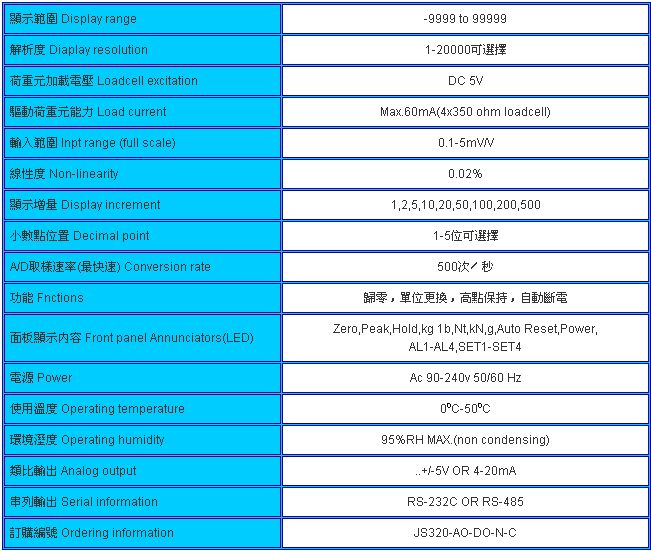 臺(tái)灣JIHSENSE JS-320_JS-320稱重顯示控制器可標(biāo)配本品牌所有模擬荷重元規(guī)格: