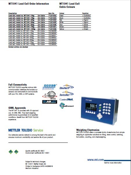 瑞士梅特勒托利多MT1041-15稱重傳感器具體型號量程:p1K廣州南創(chuàng)電子科技有限公司