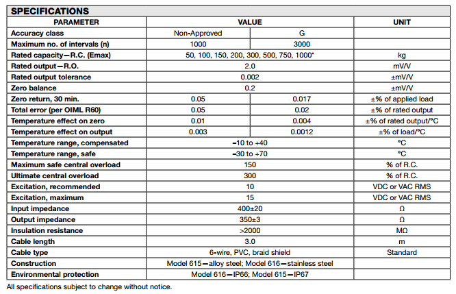 美國特迪亞tedea 615稱重傳感器系列所有量程如下:xkY廣州南創(chuàng)電子科技有限公司
