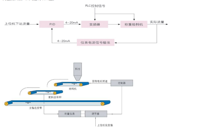 自動(dòng)配料控制系統(tǒng)在運(yùn)行使用時(shí)物料到配料皮帶秤,配料皮帶秤的重量信號(hào)和速度信號(hào)進(jìn)入控制儀表,并在儀表內(nèi)部進(jìn)行處理和顯示,同時(shí),輸出與流量成正比的4~20mA電流信號(hào)到智能調(diào)節(jié)器,調(diào)節(jié)器根據(jù)用戶設(shè)定的PID參數(shù)及理想控制值,輸出4~20mA電流到電機(jī)控制器,并由其調(diào)節(jié)給料機(jī)速度快慢,從而控制給料量。