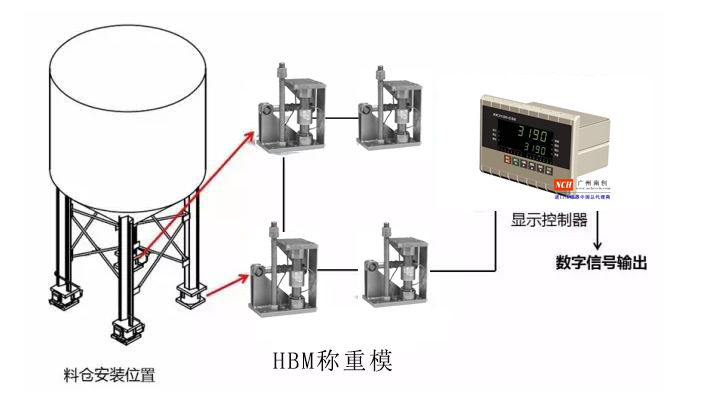 考慮到系統(tǒng)冗余,在100T料倉底部安裝4個40T容量的HBM稱重模塊,采用傳感器串聯(lián)法將信號送至顯示控制器,通過顯示控制器將信號輸出到指定的系統(tǒng)中。PmM廣州南創(chuàng)電子科技有限公司