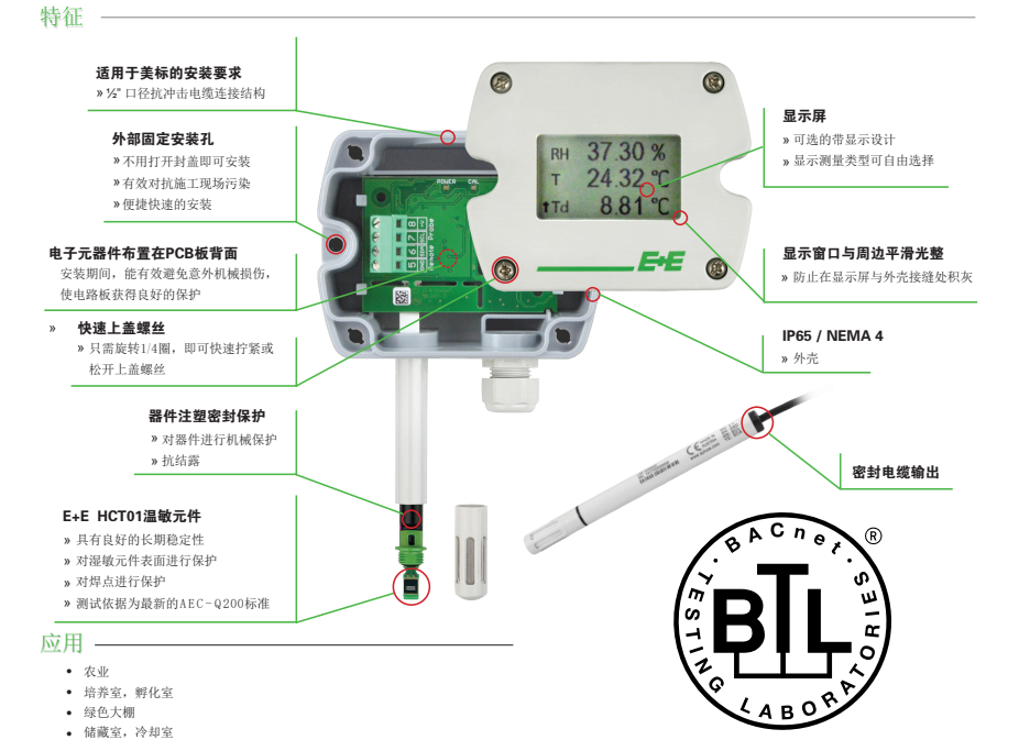E+E ee210溫濕度顯示儀表防止在顯示屬與外殼接繼處積灰  快速上蓋螺絲 IP65/NEMA 4  只需旋轉(zhuǎn)1/4圈,即可快速擰緊或 ,外光  松開(kāi)上蓋螺絲 器件注塑密封保護(hù),應(yīng)用農(nóng)業(yè) 培養(yǎng)室,孵化室 綠色大棚 儲(chǔ)藏室,冷卻室 氣象控制Ybo廣州南創(chuàng)電子科技有限公司
